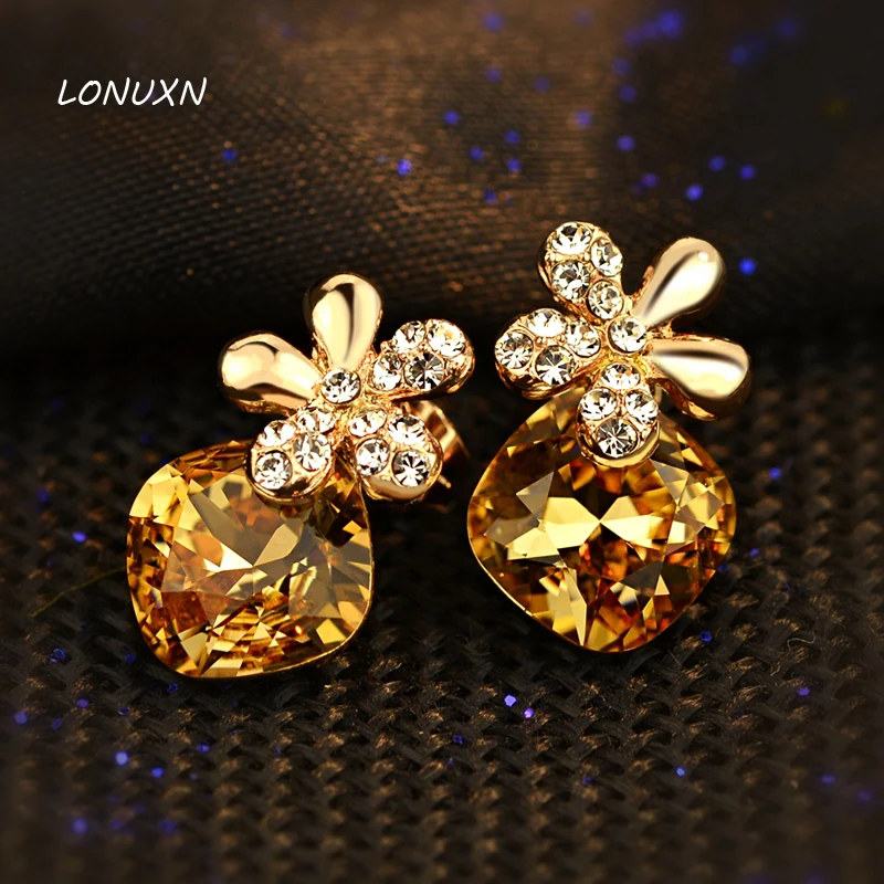 HIGH QUALITY 18*11mm gold Austria yellow Crystal Shiny cute Five leaves flowers stud earrings Women jewelry High